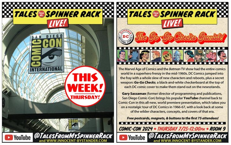 THIS IS IT! … The week of Comic-Con 2024 at the San Diego Convention Center! My Tales From My Spinner Rack LIVE! presentation, “DC Comics in the Swingin’ ‘60s: The Go-Go Checks Gambit!” is on Thursday, July 25th at 12:00 PM (Noon!) in Room 9! featuring a brand-new look at the wonkiest years of DC’s history. Here’s the official panel description: