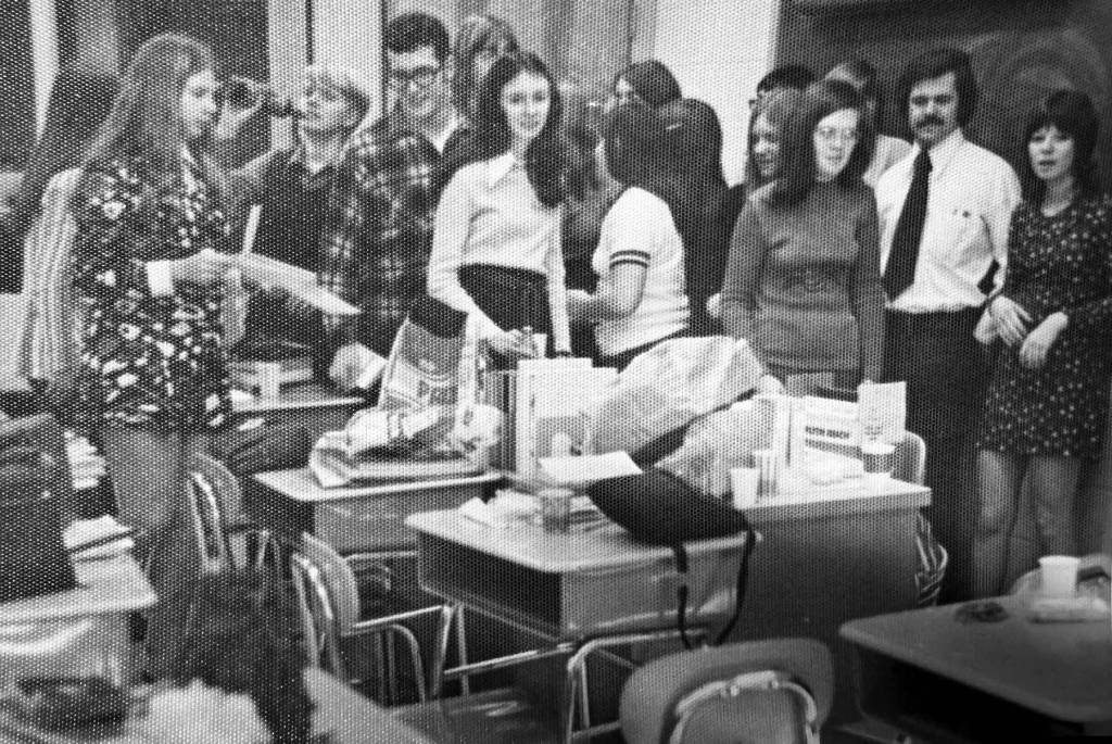 The friend’s name was Donnie, who I went through school with just about my entire kindergarten through senior year run. Donnie is a journalist, photo-journalist, author and editor, now—like me—enjoying retirement, still back in the Tamaqua area, and he’s very prolific on FB, in addition to still writing feature pieces for his longtime employer, The Times News. Where he found this photo, which is of a group of my classmates in 1969, our freshman year at the brand new Tamaqua Area High School, is beyond me, but it looks like it was taken from an old newspaper. Beyond seeing some of familiar faces (that’s Donnie fake-drinking in the background on the left side of the photo), it brought back to mind one particular incident involving one of the young ladies in this photo.