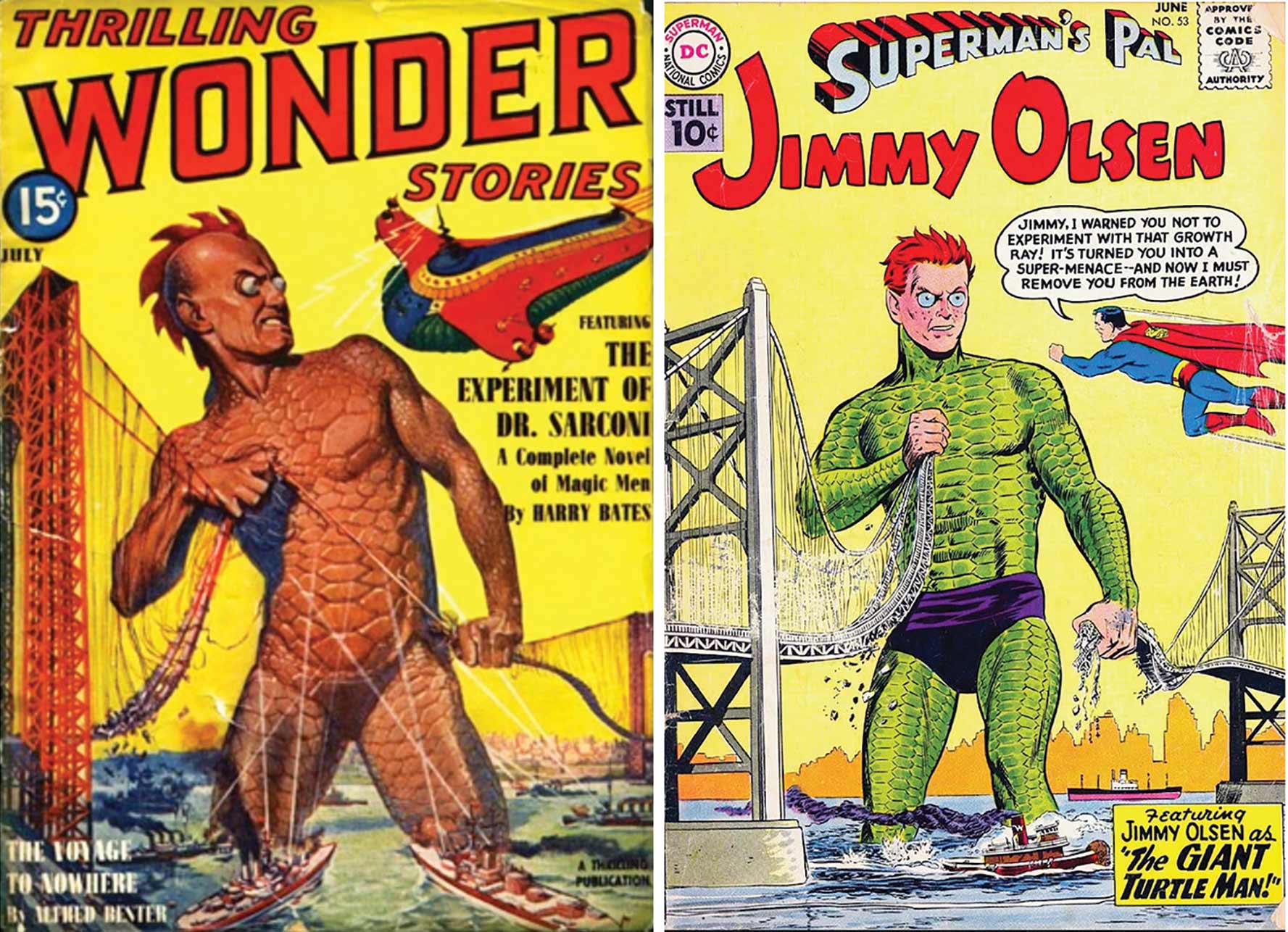 Growing up in the 1960s, I especially loved Jimmy Olsen. It had a zany appeal to me, humorous but not as far gone as DC’s licensed comics, Adventures of Bob Hope or Jerry Lewis (books we will never see reprinted, I’m guessing). This volume covers some prime Jimmy real estate, reprinting all the stories from issues 47 through 56, with a majority of them illustrated by Curt Swan. And while the Jimmy as Wolf-Man issue (number 44) will always be my favorite, the Giant Turtle Man story and cover (number 53) are up there in my fondest memories of the title. That story was a case of Superman Family editor Mort Weisinger ripping off himself, from the days he was a pulp magazine editor of titles such as Thrilling Wonder Stories (see below). I think there’s also another instance—pre-Jimmy Olsen—of a “Giant Turtle Man” cover on one of the DC science fiction books, but I was unable to find it.