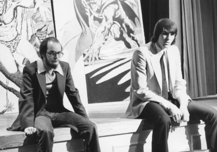 Shooter was a native son of Pittsburgh and he came to the Pittsburgh Comix Club’s PittCon in 1979. I interviewed him on a panel … that’s me on the left in this photo, including weird hair and large collar, with him on the stage of the community room at the Monroeville Mall, where the con was held that year. I just happened to have my portfolio with me, and Shooter looked through it. When he came across my pen and ink illustration of Alan Alda from MASH, he paused and said, “This is the kind of art I want in our magazines. Can you put something together for me to present to the editor?” (Looking back at the fairly lousy photo of this piece [below], God knows what he saw in my work. But the cross-hatching was nice.)