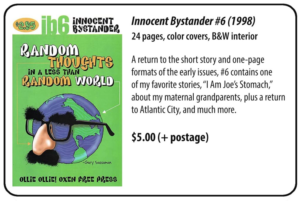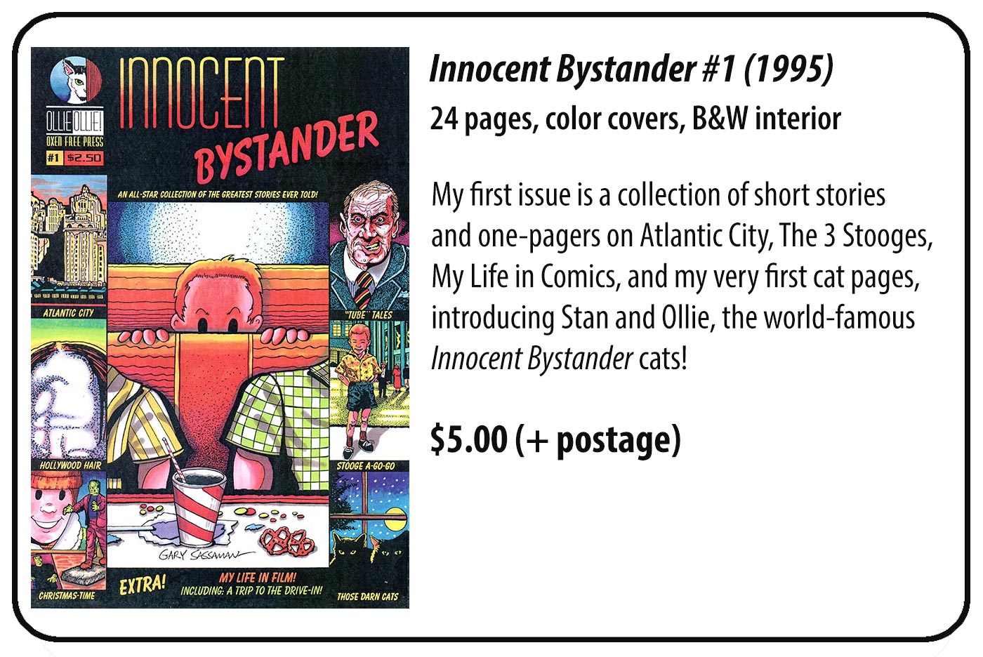 You probably won’t find them on Amazon or in your local indie bookstore or comic book shop, but the entire Innocent Bystander oeuvre is still available … only from me!